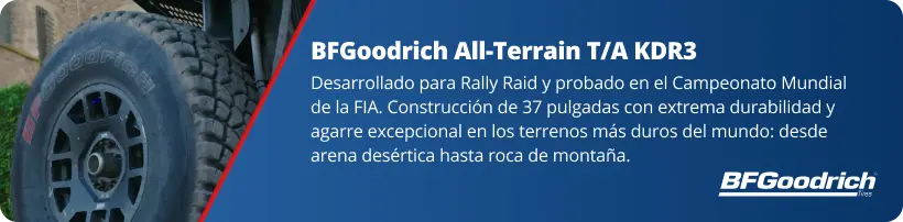 | Neumáticos | 37 pulgadas BFGoodrich All-Terrain T/A KDR3 |