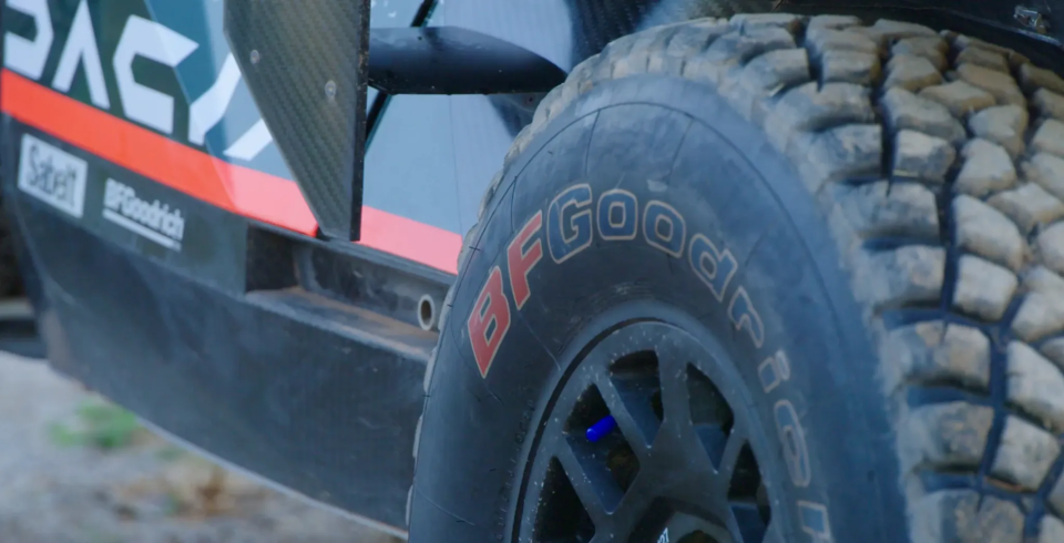 Estos neumáticos cuentan con flancos reforzados, un dibujo optimizado para superficies sueltas y una construcción diseñada para soportar pinchazos e impactos fuertes. Durante el rodaje, el equipo explicó que la vida útil de los neumáticos varía drásticamente en función del terreno, ya que las superficies duras desgastan los neumáticos mucho más rápido que las dunas del desierto.
